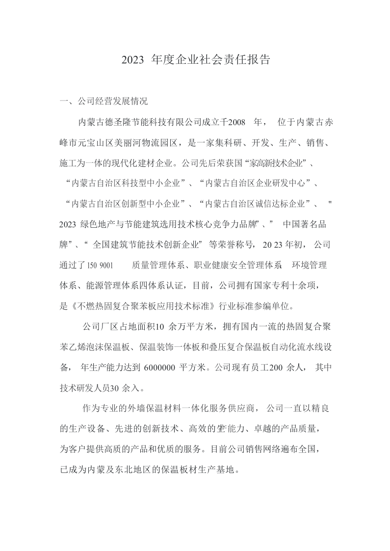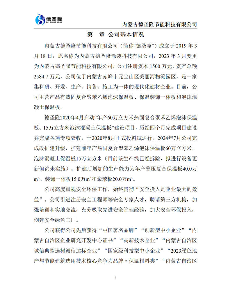 內蒙古德圣隆節能科技有限公司成立于2019年,位于內蒙古赤峰市元寶山區美麗河鎮物流園區,是一家集科研、開發、生產、銷售、施工為一體的現代化建材企業。公司主營產品:熱固復合聚苯乙烯泡沫保溫板、保溫裝飾一體板和泡沫混凝土保溫板,年生產能力達到6000000平方米。